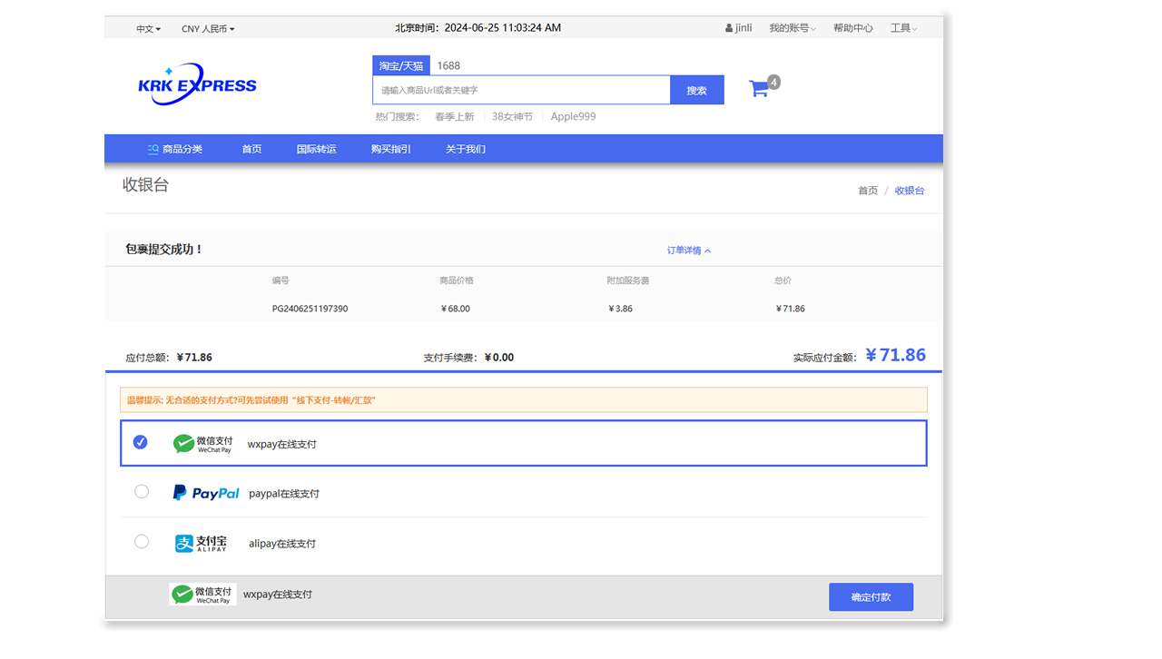 您支付完商品费用后,订单请求会推送到KRKEXPRESS平台采购请求中。